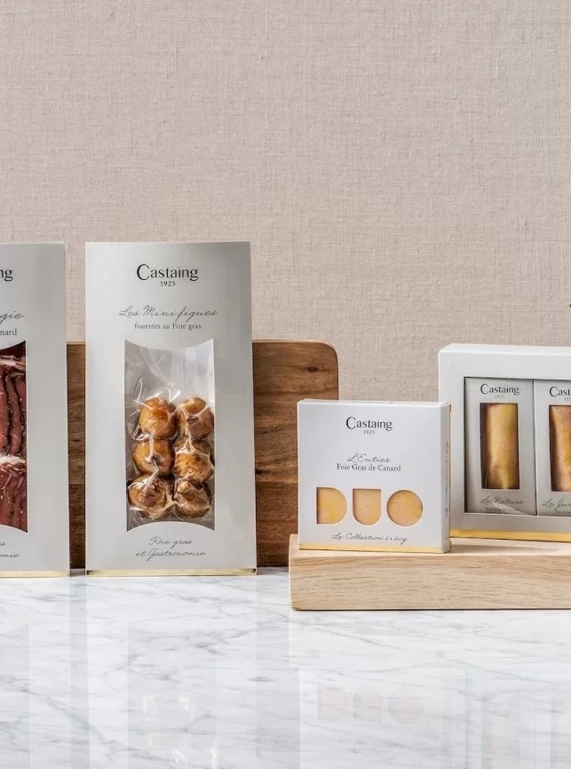 Castaing propose une collection diversifiée : foie gras entier de canard et d’oie, blocs nature, foie gras truffé, terrines, rillettes et “gourmandises au foie de canard”.