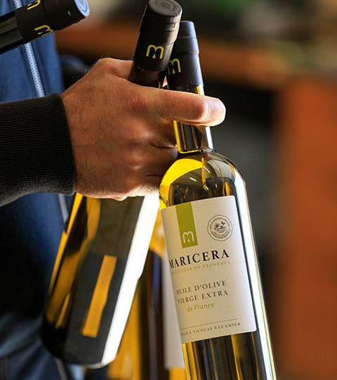 Maricera produit une huile d’olive AOP Vallée des Baux-de-Provence, fruit d’un assemblage de cinq variétés traditionnelles (Aglandau, Salonenque, Grossane, Verdale, Picholine). Cet assemblage donne une huile aux arômes complexes, disponible en version « fruité vert » ou « fruité mûr », selon la maturité des olives.