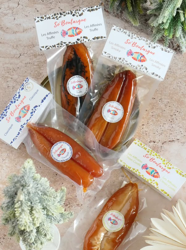 La gamme So’Boutargue inclut des boutargues “classiques” — salées et affinées selon la tradition, ainsi que des boutargues affinées ou aromatisées : truffe, agrumes (mandarine, citron), épices, harissa, baies, etc.