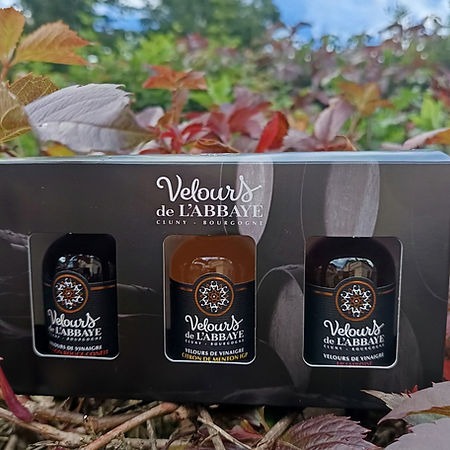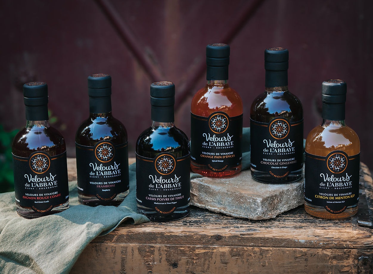 • Des “Velours de vinaigre” aromatisés, framboise, citron de Menton, fleurs de sureau, oignon rouge confit, orange pain d’épices, cassis/poivre de Timut, chocolat/gingembre…, offrant une texture sirupeuse, un goût concentré et une grande créativité culinaire.
